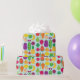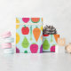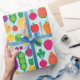 A pattern of happy colourful fruit and vegetables on a blue background, including a peach, banana, pineapple, watermelon, pear, cherries, radish, aubergine (eggplant), brussels sprout, peas, radish and red pepper (bell pepper).