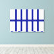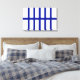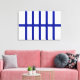 Inspired by a map symbol for railroad tracks, five blue stripes are split in half by a blue line down the centre. The blue on white geometric pattern has a clean, sleek look.