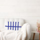 Inspired by a map symbol for railroad tracks, five blue stripes are split in half by a blue line down the centre. The blue on white geometric pattern has a clean, sleek look.