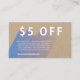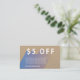 Customise this trendy discount business marketing card. This is perfect for an e-commerce business such as a boutique, Etsy store, or any other small business. It features the phrase "$5 OFF" and has customisable text to explain further special offer details . Reverse side has company contact information.