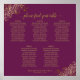 This 5 table wedding seating chart will help your guests find the right table at your reception. The design is both simple and elegant with gold text on a magenta or cassis purple background and lacy floral filigree in the corners. The title reads "please find your table" in an elegant script calligraphy. Sophisticated and chic. Includes table assignments for 50 guests with 10 seats per table.