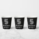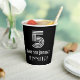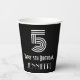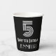 This Roaring Twenties inspired and vintage appearance birthday themed paper cup design features a large art deco inspired appearance number “5”, along with the birthday greeting message “Happy 5th Birthday,” and a personalised name. The background is coloured black. Birthday themed paper cups like this might be used at a birthday party celebrating somebody’s fifth birthday. [~Z0000542]