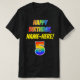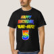 The front of this colourful, bold, and fun birthday-themed shirt design features a large number "5" and the message "HAPPY BIRTHDAY,", both coloured with a rainbow spectrum gradient inspired pattern, along with a bold yellow editable name. Cheerful birthday-themed shirts like this might be worn by the guests at somebody’s fifth birthday party. [~Z0000473]