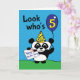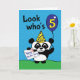 Our sweet little panda friend is wishing a special little boy a happy 5th birthday! In one hand, he's holding a handmade birthday card that says "Happy Birthday" with a cute red heart. In the other hand, he's holding a bright blue balloon (with a big yellow number 5). Card background is fun swirls on light blue. Original illustration by Bethany J. Mitchell of Darcy Place Studio.