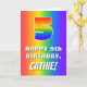 The front of this joyful and fun birthday themed greeting card design features a large number “5” with a rainbow spectrum inspired gradient pattern, along with the message “HAPPY 5th BIRTHDAY,”, and a personalised name. The background of the front also has a cheerful multicolored rainbow spectrum gradient pattern. The inside has a personalised birthday greeting message, or could perhaps be cleared and left blank if a message is to be written by hand instead. A cheerful, personalised birthday greeting card like this might be a fun way to send some birthday wishes to somebody who is celebrating their fifth birthday. [~Z0000570]
