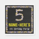 This fun, nature-inspired birthday-themed paper napkin design features a personalised name, plus the message “5th Birthday Party!”. The large number “5” plus the border both feature flower icons. Paper napkins like these might be used at a birthday party held in celebration of somebody’s fifth birthday, or some other 5th event or anniversary. [~Z0000649]