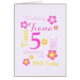 Modern text and flower 5th birthday short name personalized birthday girls card, featuring graphic flowers and your own short name in pink, white, and yellow. Personalize with your child's name (please note not all names will fit due to the nature of the font) and single-digit kids age, currently reads Tiana 5, other name lengths are available, if you need assistance contact me, happy to post one for your name. Matching gift wrap also available. A great way to give a personalized touch to a fifth birthday girl's gift. Uniquely designed by Sarah Trett for www.mylittleeden.com