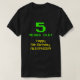 This silly and nerdy shirt design has the message "5 YEARS OLD!", the birthday greeting message "Happy 5th Birthday,", and an editable name. The upper age digit and text have a geeky, pixelated, green, 8-bit graphics style appearance inspired by that of vintage computer games and 80s era video games. The lower greeting message has a nerdy, yellow, retro digital computing inspired appearance. Shirts like this might be worn by the attendees at a birthday party being held to celebrate somebody’s fifth birthday. [~Z0000455]
