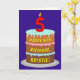 The front of this joyful and cheerful birthday themed greeting card design features a depiction of a three-tier birthday cake having a numeral-shaped candle on top showing the number “5“, along with the message “HAPPY 5TH BIRTHDAY,”, and a custom recipient name. The inside features a custom birthday greeting message, or could perhaps be cleared and left blank if a message is to be written by hand instead. A fun, customised birthday greeting card like this might be a fun way to deliver birthday greetings to somebody who is celebrating their fifth birthday. [~Z0000620]