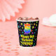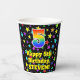 This exciting and fun birthday themed paper cup design features a large number “5” with a rainbow spectrum gradient inspired pattern, along with the message “Happy 5th Birthday,”, and an editable name. The background features a vibrant and colourful pattern featuring many star shapes with different colours and sizes. Vibrant, colourful paper cups like this might be fun to have at a birthday celebration/party being held to celebrate somebody’s fifth birthday. [~Z0000540]