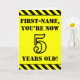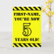 The front of this attention-grabbing and fun birthday themed greeting card design features an editable name and the message "YOU’RE NOW 5 YEARS OLD!" in black stencil style text on a yellow coloured background. There is also an eye-catching black and yellow striped pattern at the top and bottom edges of the front. The inside features a customised birthday greeting message, or could perhaps be cleared and left blank if a message is to be written by hand instead. A birthday card like this might be a fun way to send birthday wishes to somebody who is celebrating their fifth birthday. [~Z0000413]