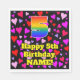 This colourful and fun birthday themed paper napkin design features a large number “5” having a rainbow spectrum gradient inspired pattern. It also features the message “Happy 5th Birthday,”, and a customisable name. The background features a pattern of purple, pink, and red heart shapes of various sizes. Loving, upbeat paper napkins like this might be fun to use at a birthday party/celebration being held to honour somebody’s fifth birthday. [~Z0000550]