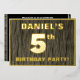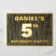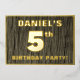 The front of this bold fifth birthday party foil invitation card features an editable name, a large number “5th”, the message “BIRTHDAY PARTY!”, and a border, all in foil. There is a rustic, yet elegant, faux wood grain appearance inspired pattern for the background of the front. The back features personalised details about the event, such as the date, time, location/venue, and any other useful information. Customised invitations like these might be used to invite guests to a birthday gathering/party being held to honour somebody’s 5th birthday. [~Z0000598]