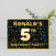The front of this exciting fifth birthday celebration foil invitation card design features a customisable name, a large number “5th”, the message “BIRTHDAY PARTY!”, and a border. The background of the front features an eye-catching, colourful pattern of musical symbols. The back features personalised details about the event, such as the date, time, place, and any other important information. Customised invitations like these might be a fun way to invite guests to a birthday gathering/party being held to celebrate somebody’s 5th birthday. [~Z0000601]