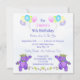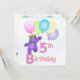 5th birthday party custom invitation featuring a cuddly and cute purple teddy bear princess dressed up in a lovely yellow jewelled crown and pink, blue and green flower accessories holding a bunch of balloons with the word PARTY on them. Personalising with child's name makes it extra special. Original design by Anura Design Studio.
