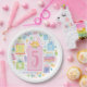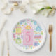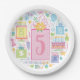 A pretty feminine paper party plate with the custom number 5 on whimsical birthday cakes and presents for any 5th birthday girly party.
