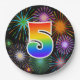 This colourful, fun, and cheerful paper plate design features a large number "5" containing a rainbow spectrum gradient inspired pattern. It also features a exciting and vibrant bursting celebratory fireworks inspired pattern. It has a black coloured background. Fun paper plates like this might be used at a celebration being held in honour of somebody’s fifth birthday, a 5th anniversary, or some other 5th event. [~Z0000490]