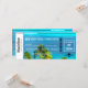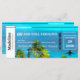 A beautiful ocean blue and Palm trees image is the background for this Boarding Pass Destination theme invitation.