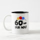 Primary colours balloons and black text that reads "60 and still hot!" on 60th birthday T-shirts, mugs, buttons, cards, and other birthday gear!