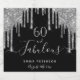 Simple and elegant 60th birthday wine label. A classic black background decorated with faux silver glitter drips, paint dripping look. With the text: 60 and fabulous. Personalise and add a name and a date. Date of birth or the date of the party. Light grey text. The word Fabulous is written with a modern hand lettered style script with swashes.