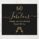 Simple and elegant 60th birthday wine label. A classic black background with two glasses, flutes as decor. With the text: 60 and fabulous. Personalise and add a name and a date. Date of birth or the date of the party. Golden letters. The word Fabulous is written with a modern hand lettered style script with swashes.