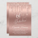 Elegant and chic sixtieth birthday party invitation featuring "60 & Fabulous" in a pretty stylish script against a rose gold background, with rose gold faux glitter dripping from the top. You can personalize with her name and the party details.