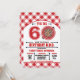 60th Birthday Barbecue Invitation with a red hot grill and gingham tablecloth pattern. Customise with your own text. Original Illustration by pj_design.