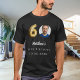 For a black, dark coloured t-shirt. White text. Personalise and add a photo, name, age, date. Faux gold looking 6-number.