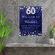 A welcome poster for a 60th birthday party. A navy blue background with elegant faux silver stars. The blue colour is uneven. Personalise and add a name and text. White letters.