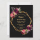 On front: An invitation for a 60th birthday party. A chic black background with a faux gold geometric frame. Decorated with dark burgundy and pink flowers, roses and boho style feathers. Templates for a name and party details. The name is written with a hand lettered style script, golden coloured letters.
