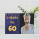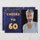 A trendy 60th birthday party invitation. With the text: Cheers to 60 on front written with faux gold balloon letters. Dark blue background, the blue colour is uneven. With golden confetti. Template for your photo.