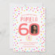 Bright colorful confetti random dots birthday 60th surprise party invitations. In bright living coral, hot pink, golden yellow and aqua blue green. Add your own birthday girl's photo in the center of the 0 in 60 and customize with your own sixtieth birthday date, time and party details. Reverse has a living coral color background with random confetti style dots. Other matching items and milestone birthday years available. Original design by www.mylittleeden.com on zazzle.