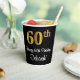 This sophisticated, stylish, and luxurious birthday themed paper cup design features a large ordinal number “60th” having an imitation/faux gold-like appearance, along with the birthday greeting message “Happy 60th Birthday,” and a custom name in a script-style font. The background is coloured black. Paper cups like this might be used when celebrating somebody’s sixtieth birthday. [~Z0000538]