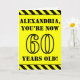 The front of this fun and attention-grabbing birthday themed greeting card design features an editable name and the message "YOU’RE NOW 60 YEARS OLD!" in black stencil look text on a yellow coloured background. The front also features an eye-catching black and yellow striped pattern at the top and bottom edges. The inside features a customisable birthday greeting message, or could perhaps be cleared and left blank if a message is to be written by hand instead. A customisable birthday card like this might be a fun way to send a message in celebration of somebody’s sixtieth birthday. [~Z0000413]