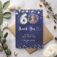 A thank you card for a 60th birthday. A navy blue background colour. The blue colour is uneven. With faux silver stars. On front: number 60 written with a balloon style font. Add a photo. Thank You, your text, title and a date.