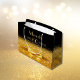 Elegant, classic, glamourous and feminine style party gift bag. A gold coloured ribbon and bow with golden glitter and sparkle, a bit of bling and luxury for a birthday. Black background. With templates for name, age, date of birth and date of anniversay.