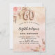 A rose gold, blush pink rustic faux metallic looking background. Decorated with rose gold and pink florals, roses, pampas grass. Personalise and add a name and party details. Number 60 is written with a balloon style font.