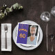 A napkin for guys 60th birthday party. Template for your photo. Blue background colour and the text: Happy 60. The text is written with a trendy faux gold balloon script. The world happy with curved letters. Golden confetti as decor.