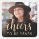 This custom 60th birthday sticker features the guest of honour's personalised photo and birthday, along with the word "Cheers" in elegant gold-coloured calligraphy script. A dark screen helps make the text pop. A great way to celebrate someone who's turning sixty!