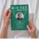 Celebrate in style with this golf-inspired invitation featuring a clever "Six-Tee (and still on par)" pun. The green background highlights a bold golf club and tee design, with a customisable photo of the birthday honoree inside the golf ball. The back showcases a golf club, adding a fun, sporty touch. Perfect for a milestone birthday celebration for any golf enthusiast! Fully customisable with event details.