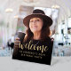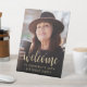 This custom 60th birthday party welcome sign features the guest of honour's personalised photo, name, and birthday, along with the word "welcome" in elegant gold-coloured calligraphy script. A dark screen helps make the text pop. A great way to celebrate someone who's turning sixty!