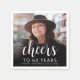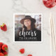 This custom 60th birthday napkin features the guest of honour's personalised photo, name, and birthday, along with the word "Cheers" in elegant white calligraphy script. A dark screen helps make the text pop. A great way to celebrate someone who's turning sixty!
