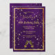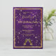 A trendy, modern 60th birthday party invitation card for a woman. A classic dark purple background, with faux gold frame and flutes, glass and bubbles, golden coloured letters. The Purple background is uneven. Templates for your party information.