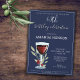 Modern 60th Birthday Red Wine Navy Blue Party Invitation. 60th birthday party invitation for her or him. Invitation with a red wine glass, roses and twigs on a navy blue background. The text is in white and is fully customisable - personalise it with your name, any age - 30th 40th 50th 60th 70th 80th 90th 100th, date, location and RSVP.