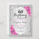 60th Birthday Invitation. Elegant floral design in silver and pink. Features faux glitter silver stripes, pink roses stylish script font and confetti. Perfect for a glam birthday party.