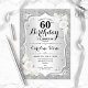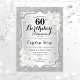 60th Birthday Invitation. Elegant floral design in silver and white. Features faux glitter silver stripes, white roses stylish script font and confetti. Perfect for a glam birthday party.