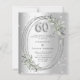 A faux silver looking background. An oval silver frame decorated with sage green greenery and faux diamonds. Personalise and add your names, details. Black text.