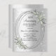 A faux silver looking background. Decorated with greenery, an oval frame and faux diamonds. Personalise and add a name and details.
