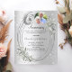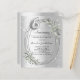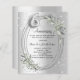A faux silver looking background. Decorated with greenery, an oval frame and faux diamonds. Personalise and add a photo, names and details.