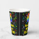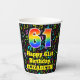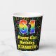 This cheerful and exciting music themed birthday paper cup design features a large number “61” with a rainbow spectrum gradient inspired pattern, along with the message “Happy 61st Birthday,”, and a personalised name. The background features a colourful pattern of various music notes and symbols having a variety of sizes and colours. Vibrant, colourful paper cups like this might be fun to have at a birthday party being held to honour somebody’s sixty first birthday. [~Z0000541]